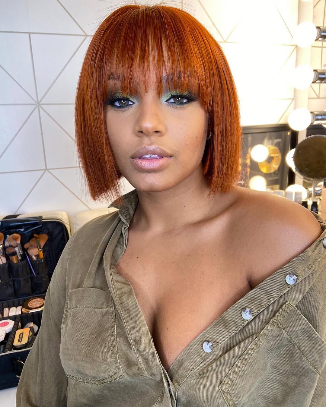 La Remy Chesnut est un bob Lisse à frange avec coloration Modèle similaire: Hair, Copper, Auburn.