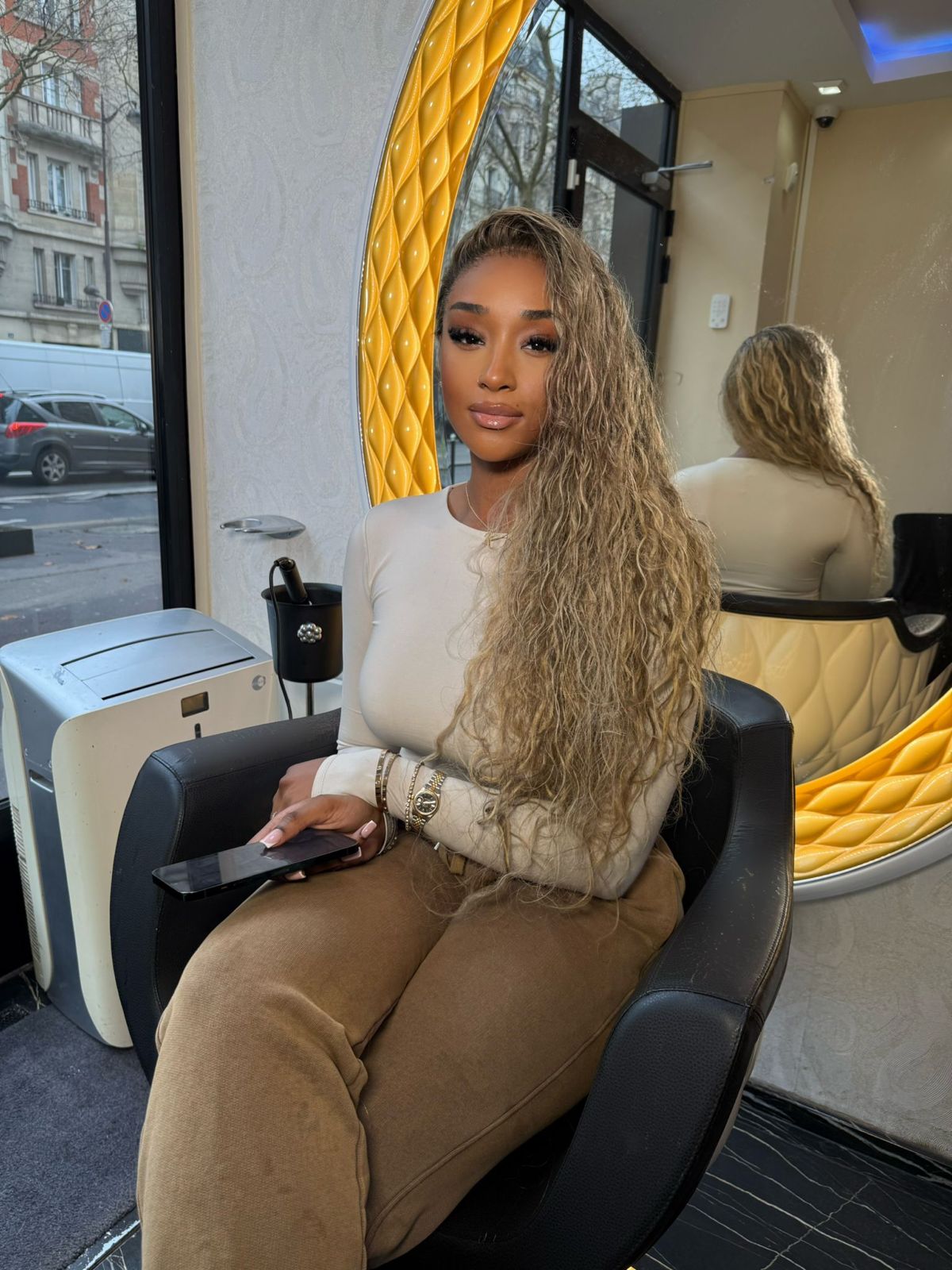 Les mèches utilisées sont de type Wavy Blond, avec une densité par défaut de 3 paquets, assurant un volume généreux, équilibré et parfaitement adapté aux looks les plus sophistiqués.